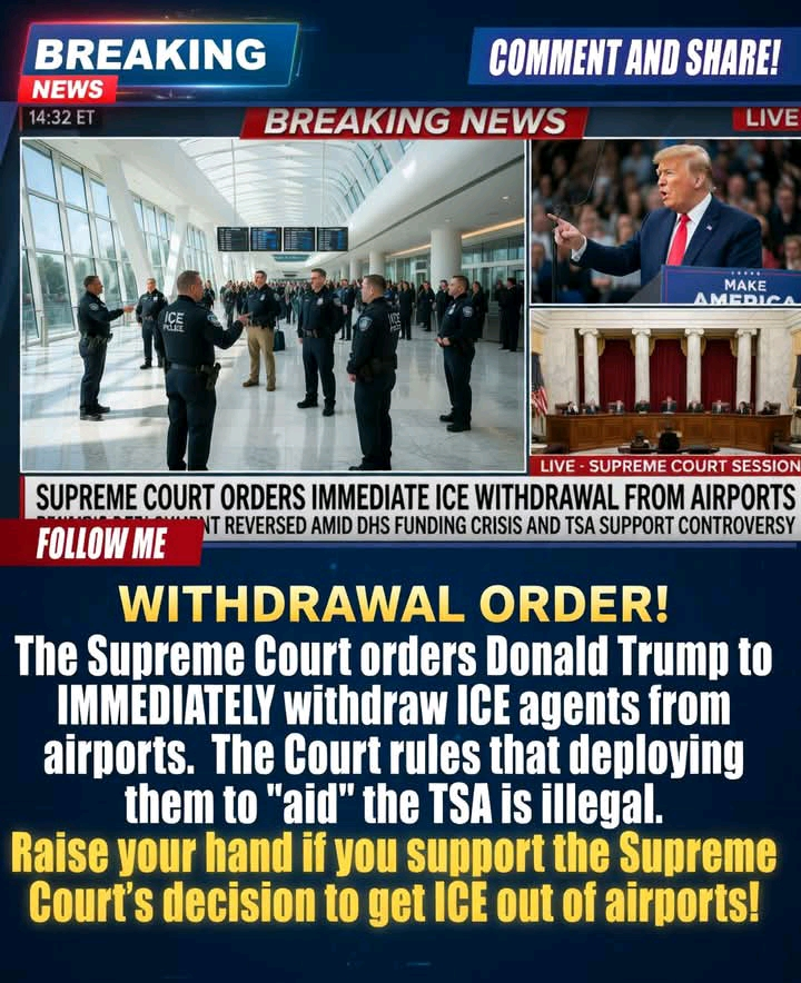 Title: JUDICIAL BLOW! Supreme Court Orders Immediate Withdrawal of ICE from Airports: Donald Trump’s Security Plan Suspended