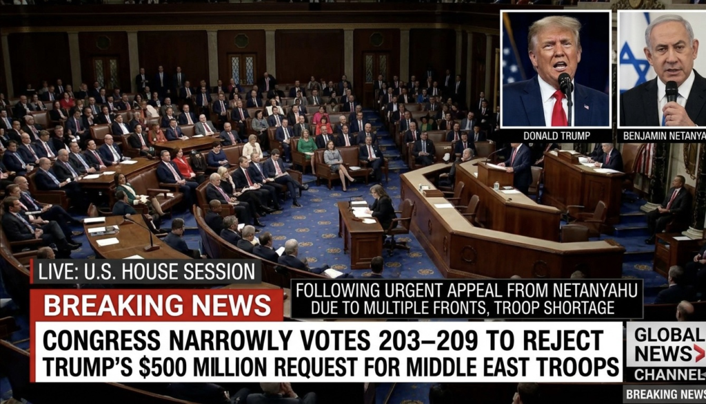 • United States Congress Narrowly Votes 203–209 to Reject Donald Trump’s $500 Million Request to Fund Additional Troop Deployment to the Middle East Following Urgent Appeal from Benjamin Netanyahu due to shortage of Troops due to fighting Multiple Fronts